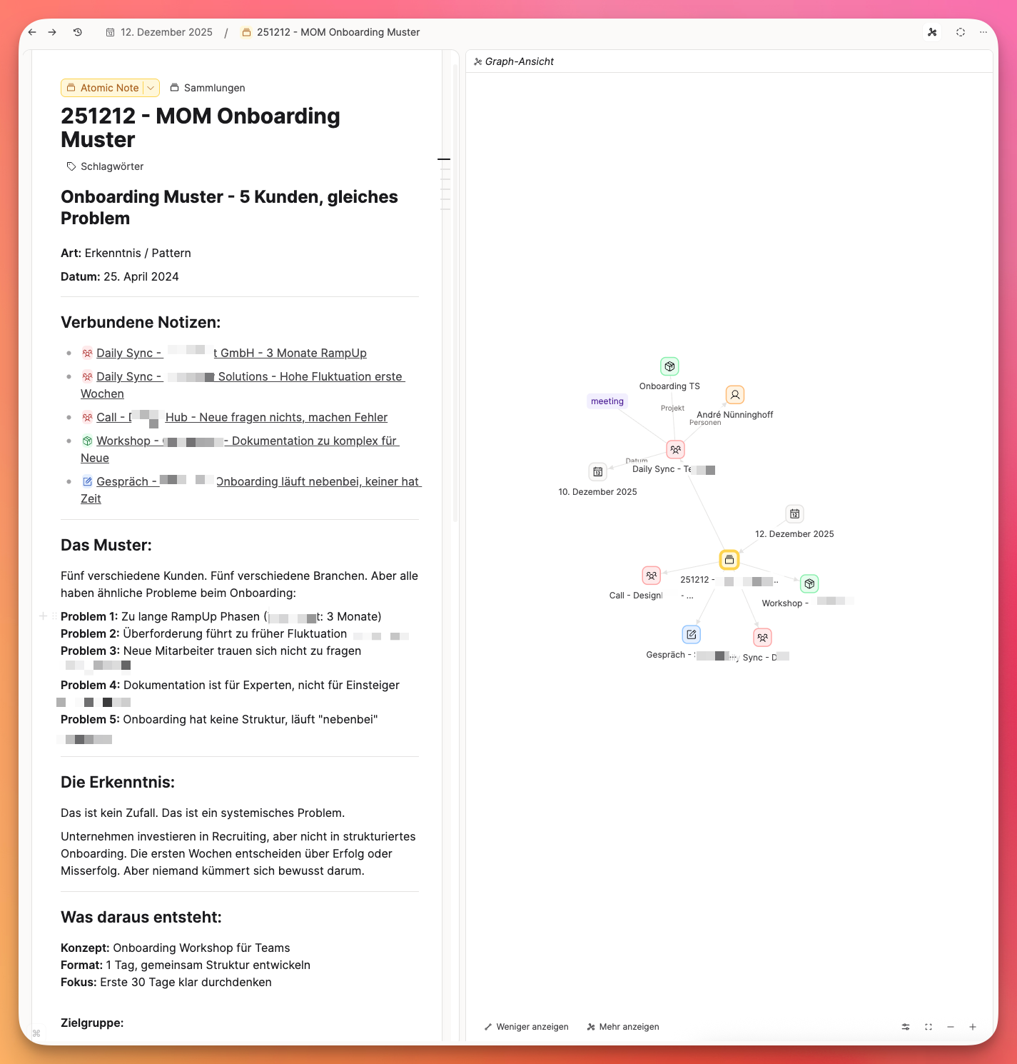 Zwei Wochen später, anderer Kunde, anderes Projekt. Wieder das Thema Onboarding. Diesmal: „Wir verlieren viele neue Leute in den ersten Wochen. Die fühlen sich überfordert.“ Wieder eine Notiz. Diesmal mit einem Link zur ersten.