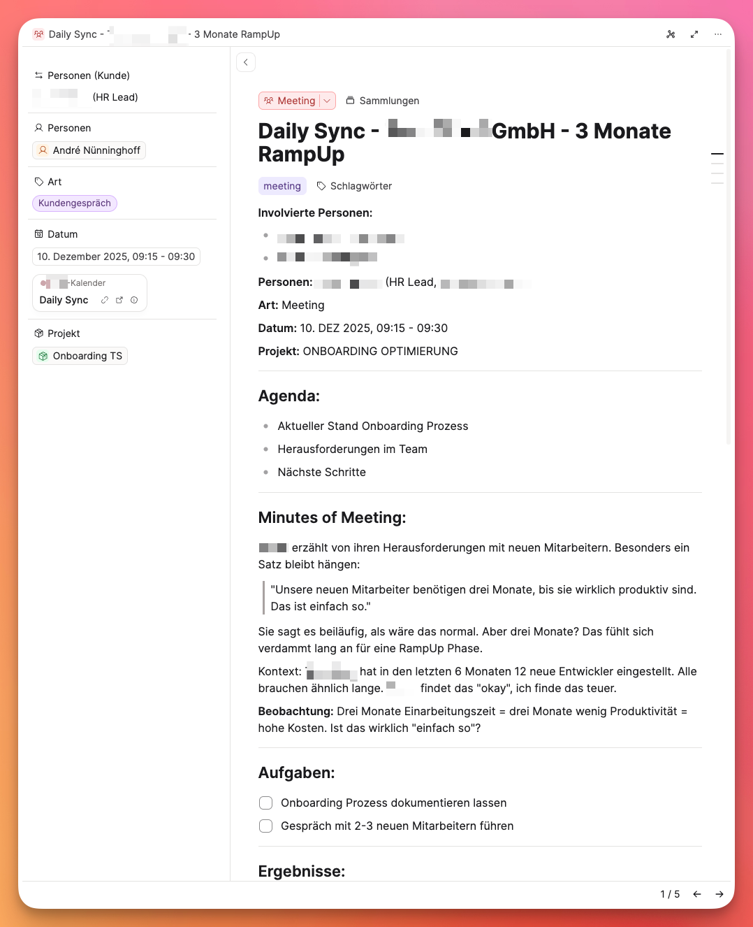 Meine Meetingnotizen sind heute keine Protokolle mehr. Sie sind Rohmaterial. Aussagen von Kunden werden zu wiederkehrenden Mustern. Probleme tauchen in verschiedenen Projekten auf und verbinden sich. Daraus entstehen Konzepte, Angebote, bessere Entscheidungen. Ein PKM hilft nicht nur beim Erinnern, sondern beim Verstehen.