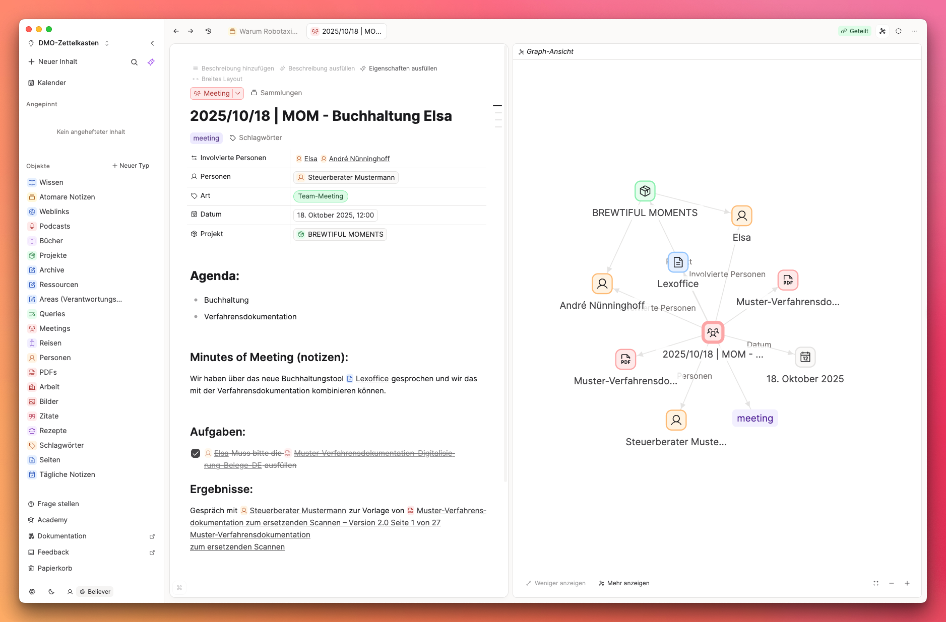 Mit der Zeit erkennst du, dass dein System zu einer Art Spiegel wird. Es zeigt dir, worüber du nachdenkst, was dich interessiert und wie sich deine Themen verbinden. Und vorallem, findest du auch Dinge wieder, anstatt sie immer neu als Notizu zu hinterlegen