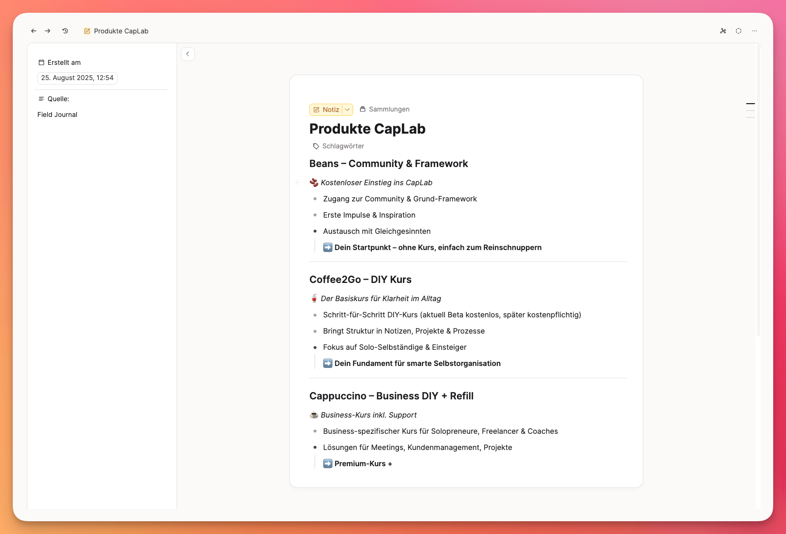 Er ist der praktische Teil des CapLabs. Während das BEANS Framework die Grundlagen legt, bringt der Coffee2Go Kurs sie in die Anwendung. Du lernst, Wissen zu gestalten, Routinen aufzubauen und dein Denken bewusst zu steuern. Du arbeitest nicht für dein System, dein System arbeitet für dich.