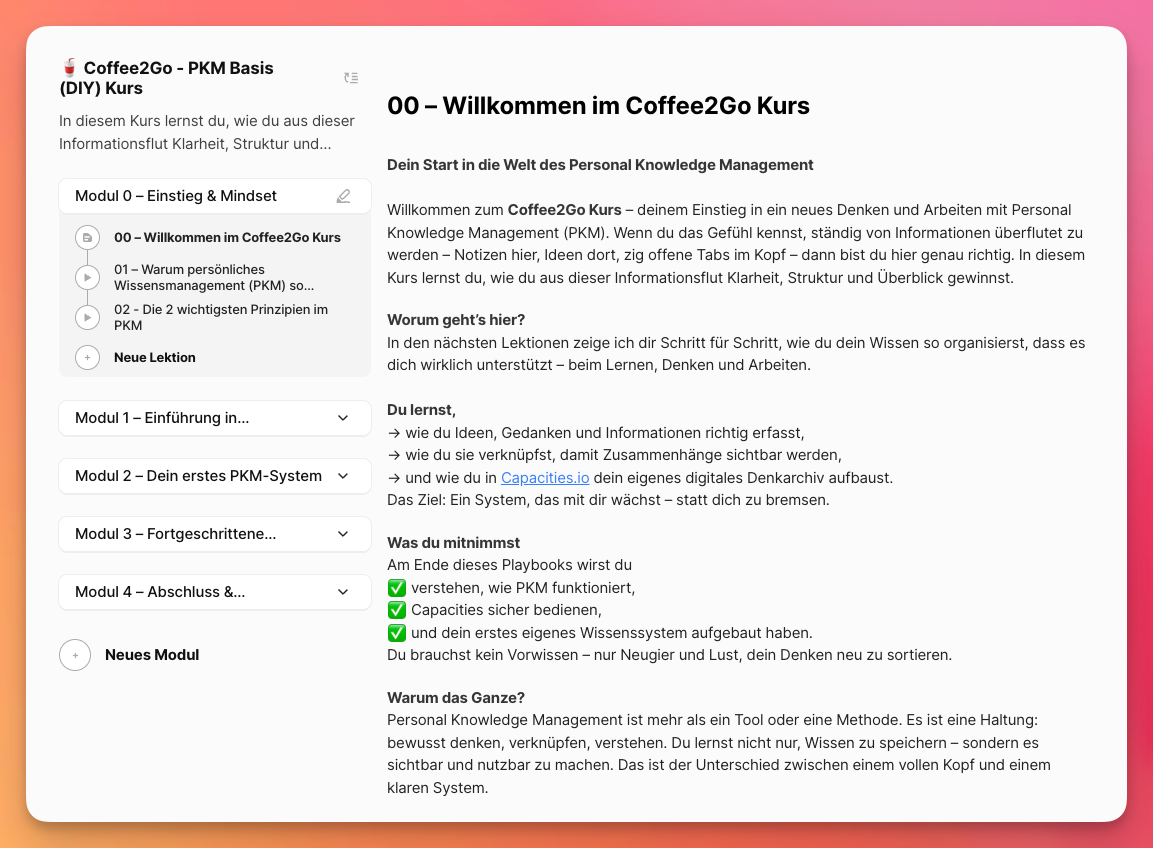 Das Besondere an diesem Kurs ist die Einfachheit. Keine Vorgaben, keine Pflichtmodule, keine Tests. Nur Inhalte aus meinen eigenen Erfahrungen, die dir zeigen, wie du Wissen lebendig hältst. Je länger du damit arbeitest, desto natürlicher wird dein Denken vernetzt. Das ist der Punkt, an dem PKM zu etwas Persönlichem wird.