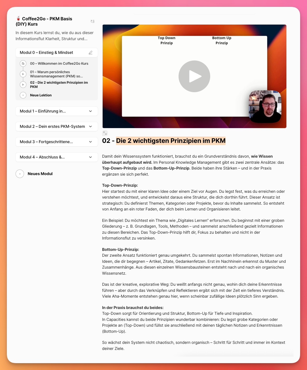 Ein gutes PKM lebt von Wiederholung. Der Coffee2Go Kurs zeigt dir, wie du Routinen aufbaust, die sich natürlich anfühlen. Du lernst, wie du dein System regelmäßig pflegst, ohne dass es dich stresst. Fünf Minuten am Tag reichen. Eine kleine Notiz, ein Gedanke, ein Rückblick.
