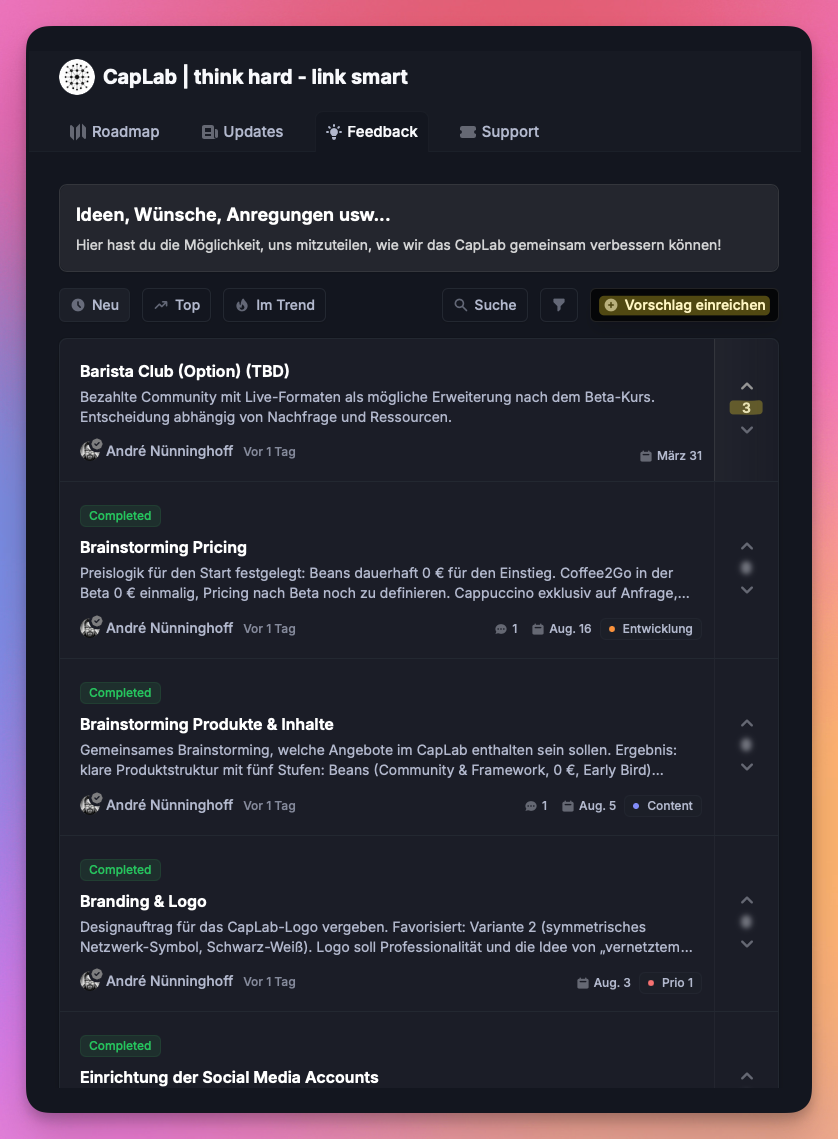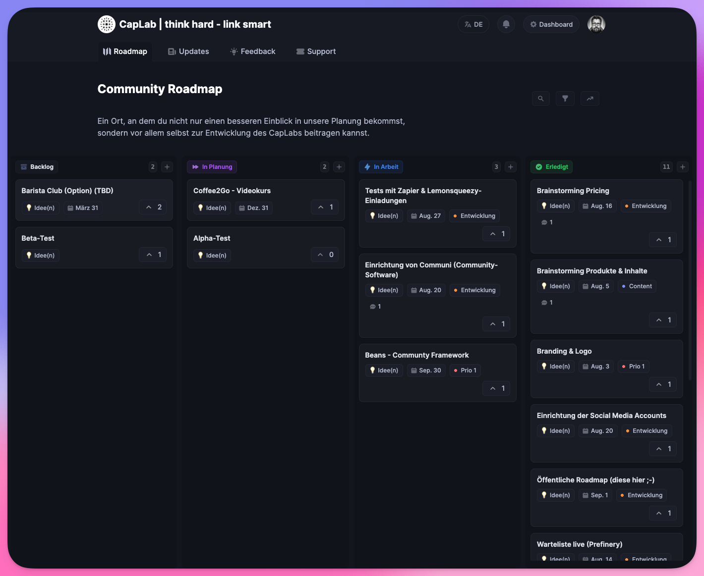 Transparenz spart Zeit und Energie. Wer die Roadmap anschaut, erkennt sofort, wie das CapLab aufgebaut wird und was gerade in Entwicklung ist. Am Ende wächst das Ergebnis nicht im stillen Kämmerlein, sondern gemeinsam mit allen, die Interesse haben, diese „Reise“ zu begleiten.