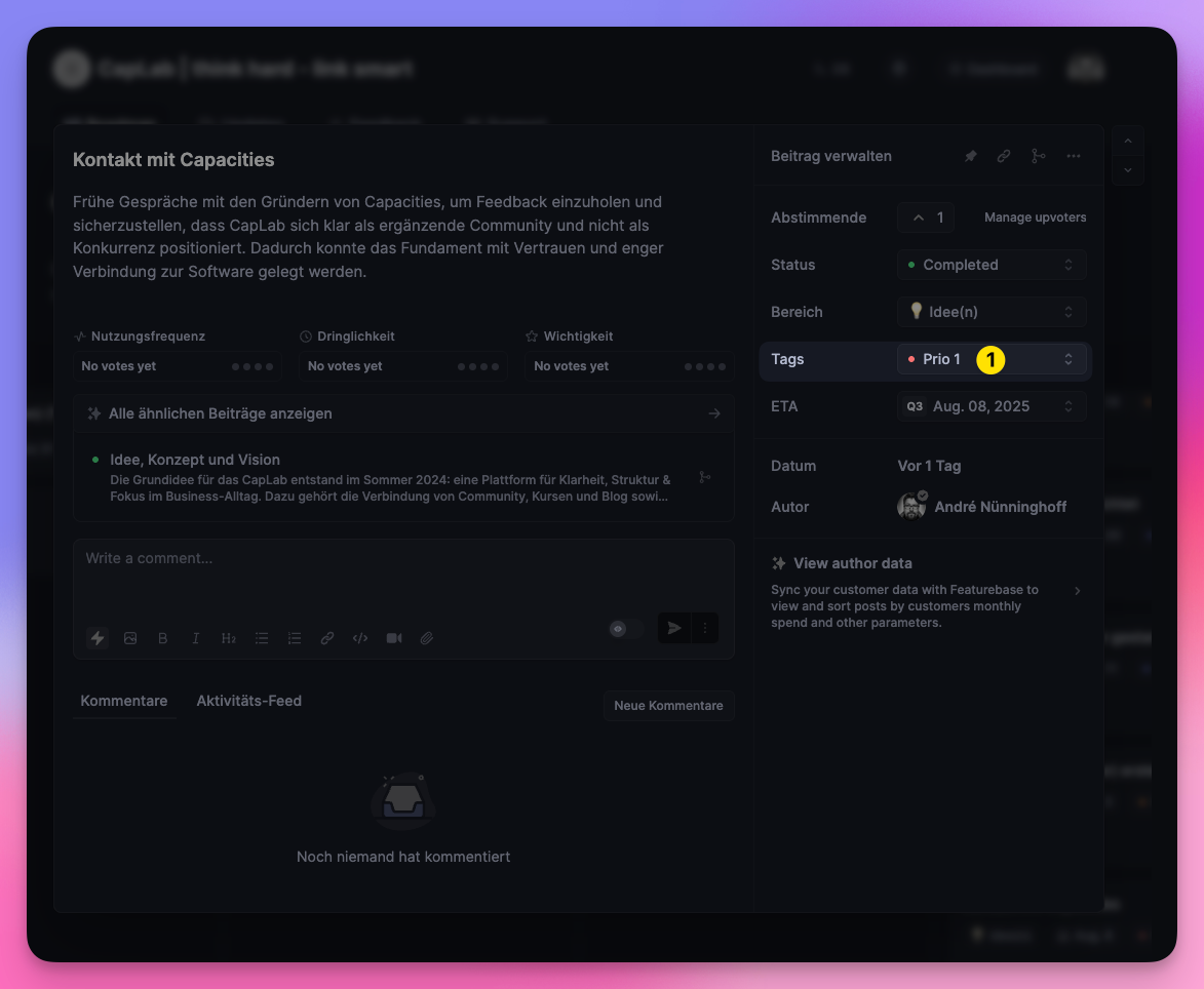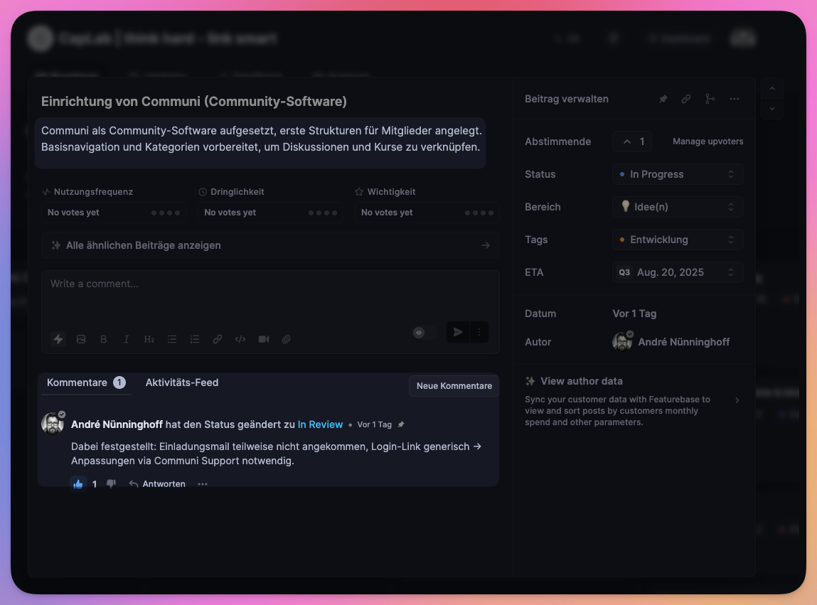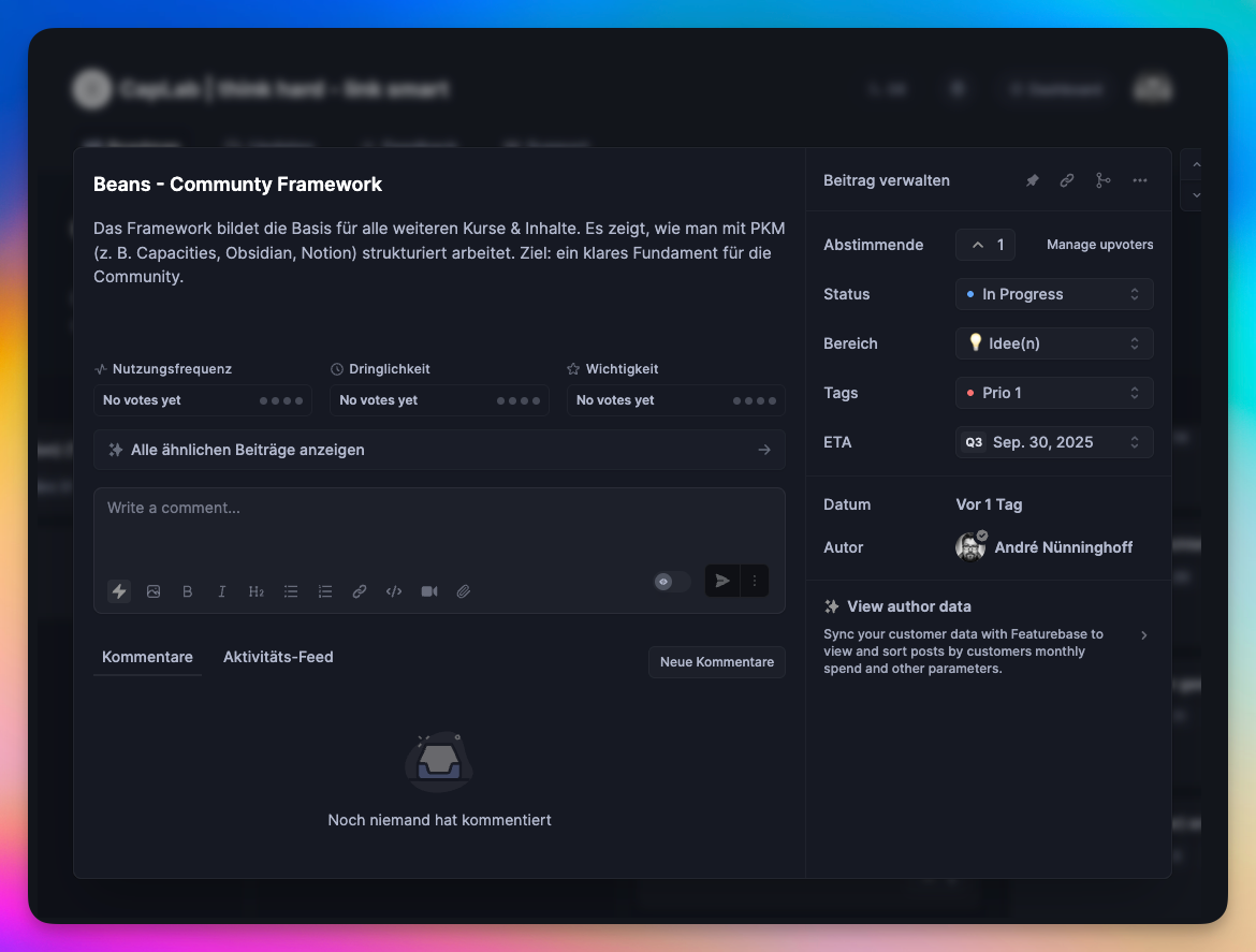 Eine Roadmap ist das Werkzeug, um Fortschritt(e) greifbar zu machen. Sie zeigt Status, Prioritäten und Richtung in einem Blick. Ich habe mich für Featurebase entschieden, weil dort Spalten wie: