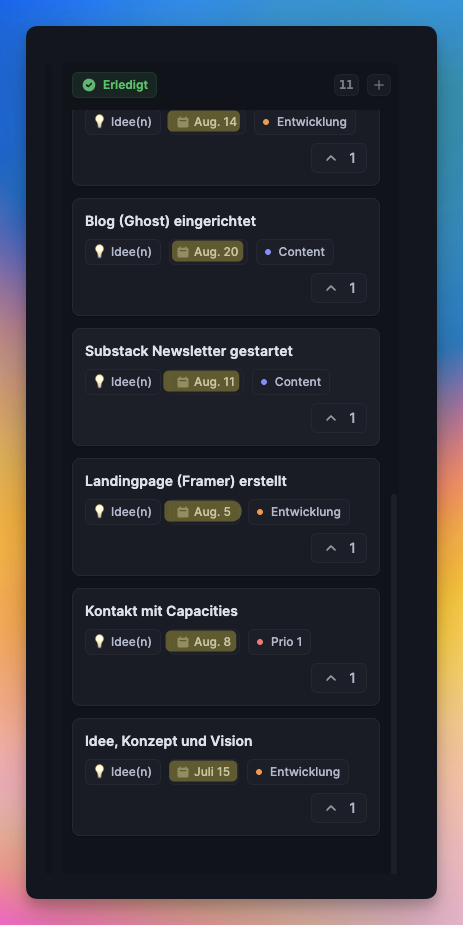 Das CapLab richtet sich an Menschen, die Verantwortung tragen. An alle, die am Montagmorgen die richtigen Informationen brauchen, um gute Entscheidungen zu treffen. An alle, die Klarheit und Fortschritt im Alltag schätzen. Somit bleibe ich dabei: #buildinpublic ist dafür die passende Form. Ehrlich, effizient und verbindlich.