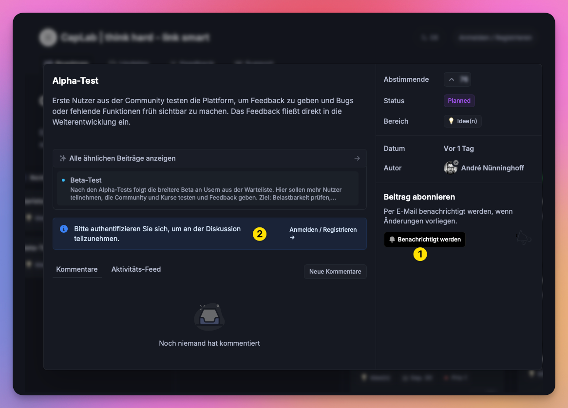 Gleichzeitig lässt sich jedes Thema auch gezielt verfolgen. Wer sich zum Beispiel für den Alpha-Test interessiert, kann genau dazu Updates abonnieren oder direkt in der Roadmap kommentieren. So bleibst du entweder breit informiert oder tauchst tiefer in einzelne Bereiche ein – genau so, wie es für dich am besten passt.